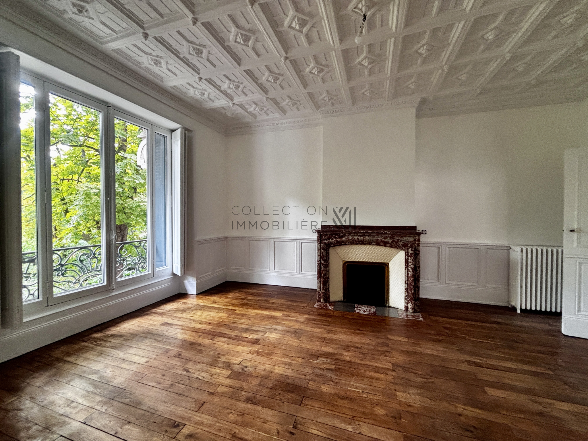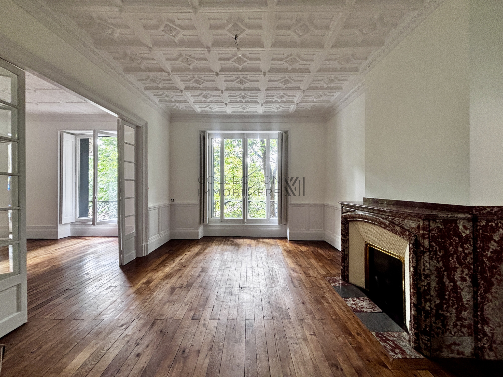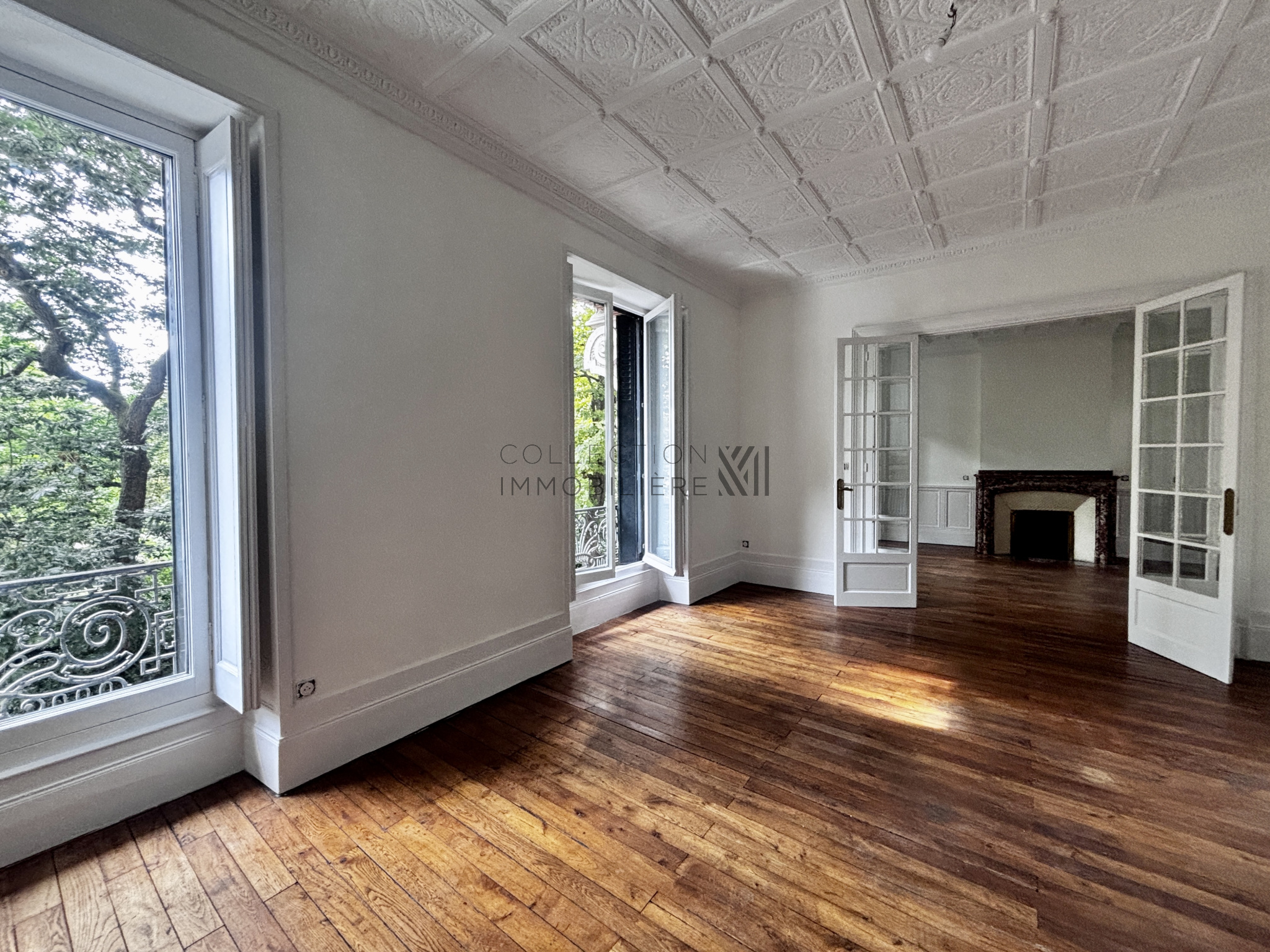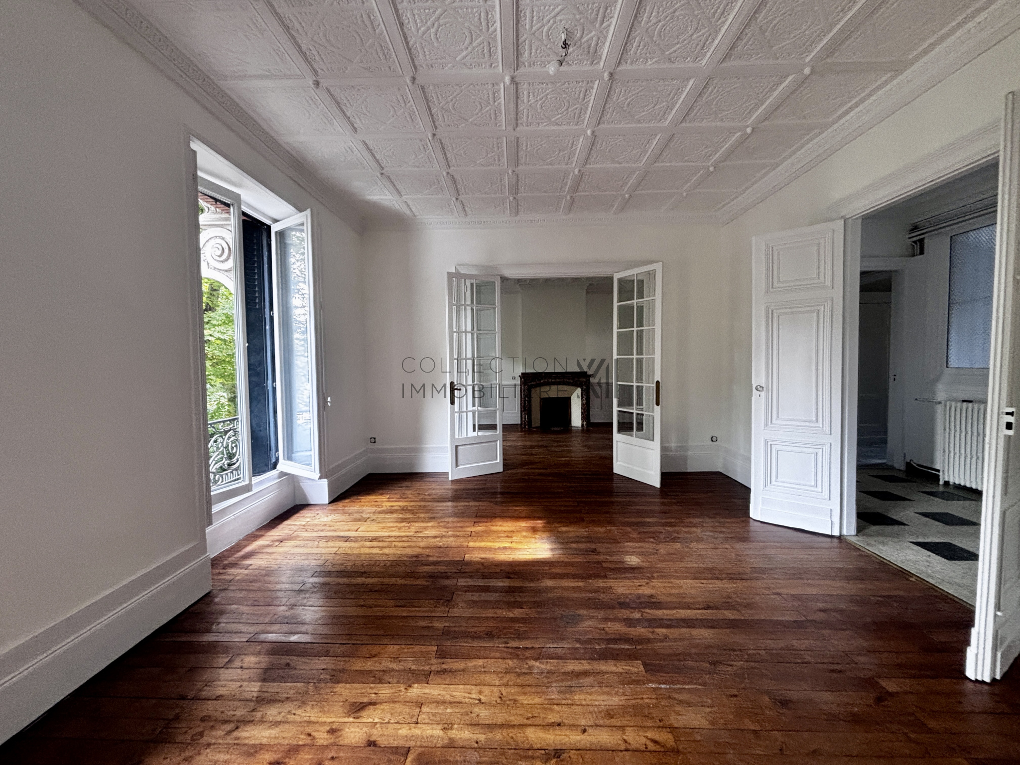 L’entrée s’ouvre sur un magnifique double séjour lumineux, doté d’un parquet d’origine, de plafonds ornés de moulures et de cheminées en marbre, créant une atmosphère chaleureuse et raffinée.