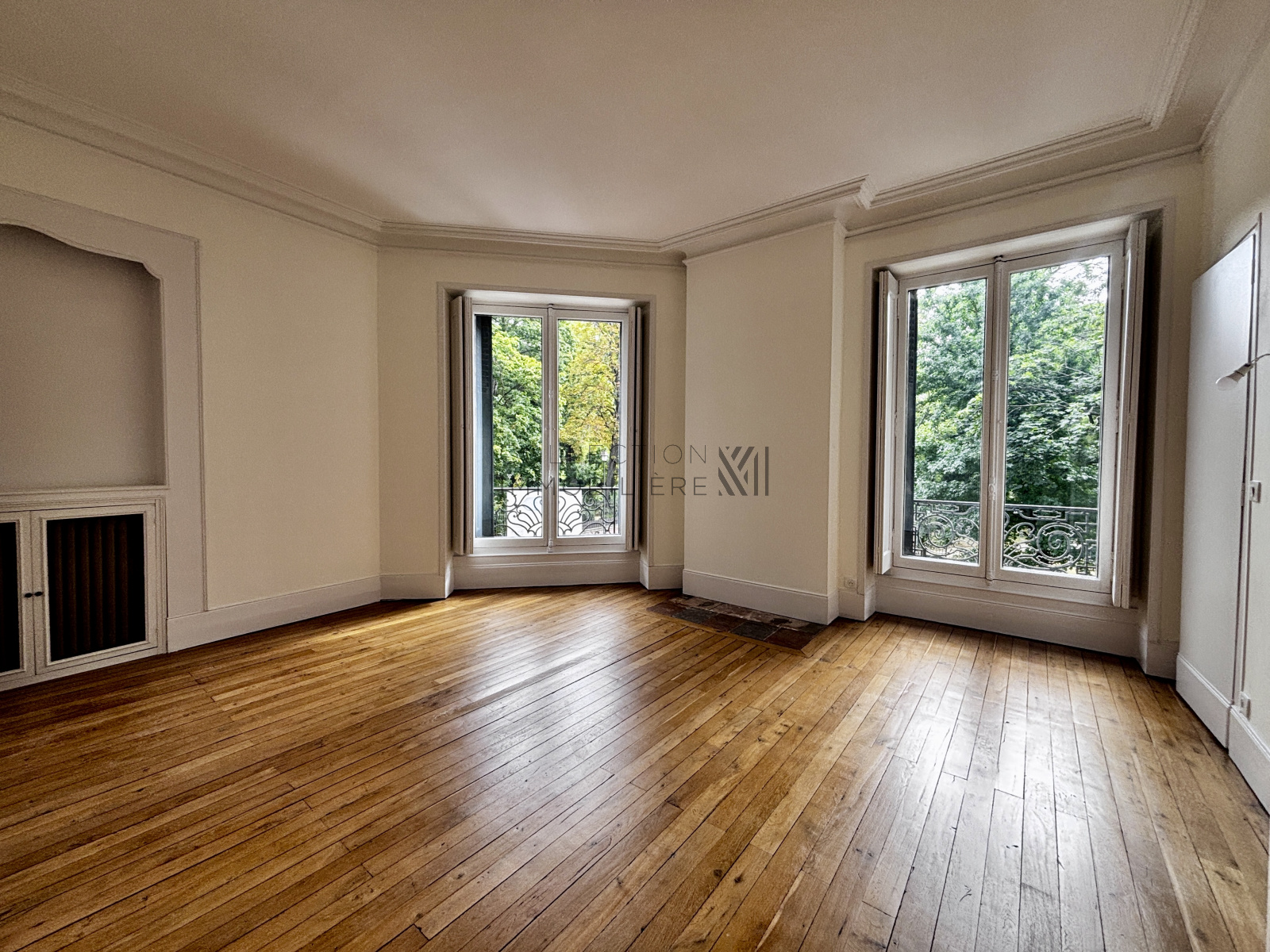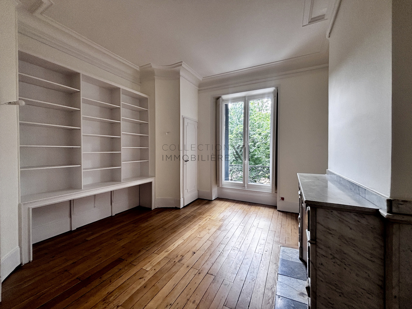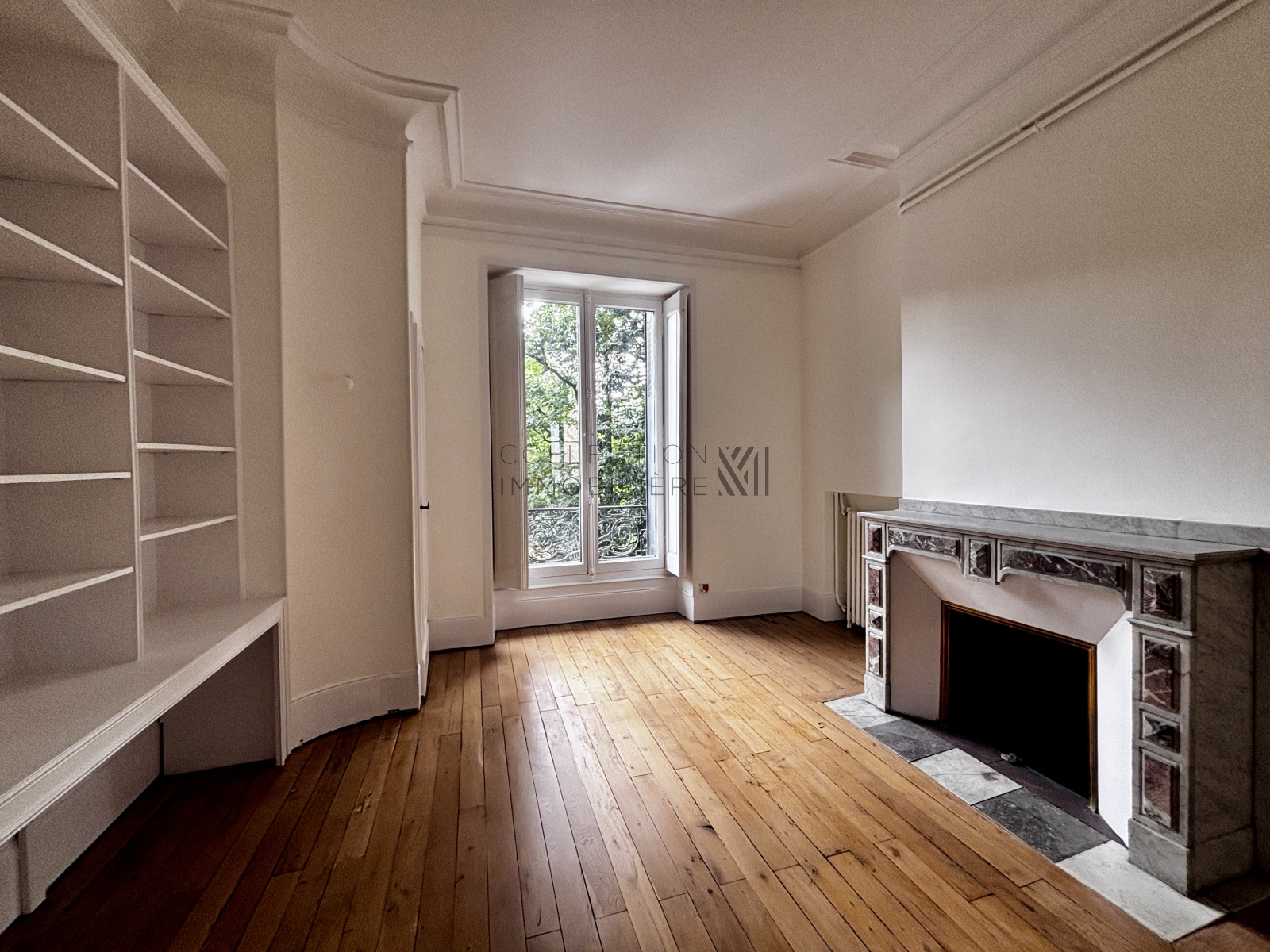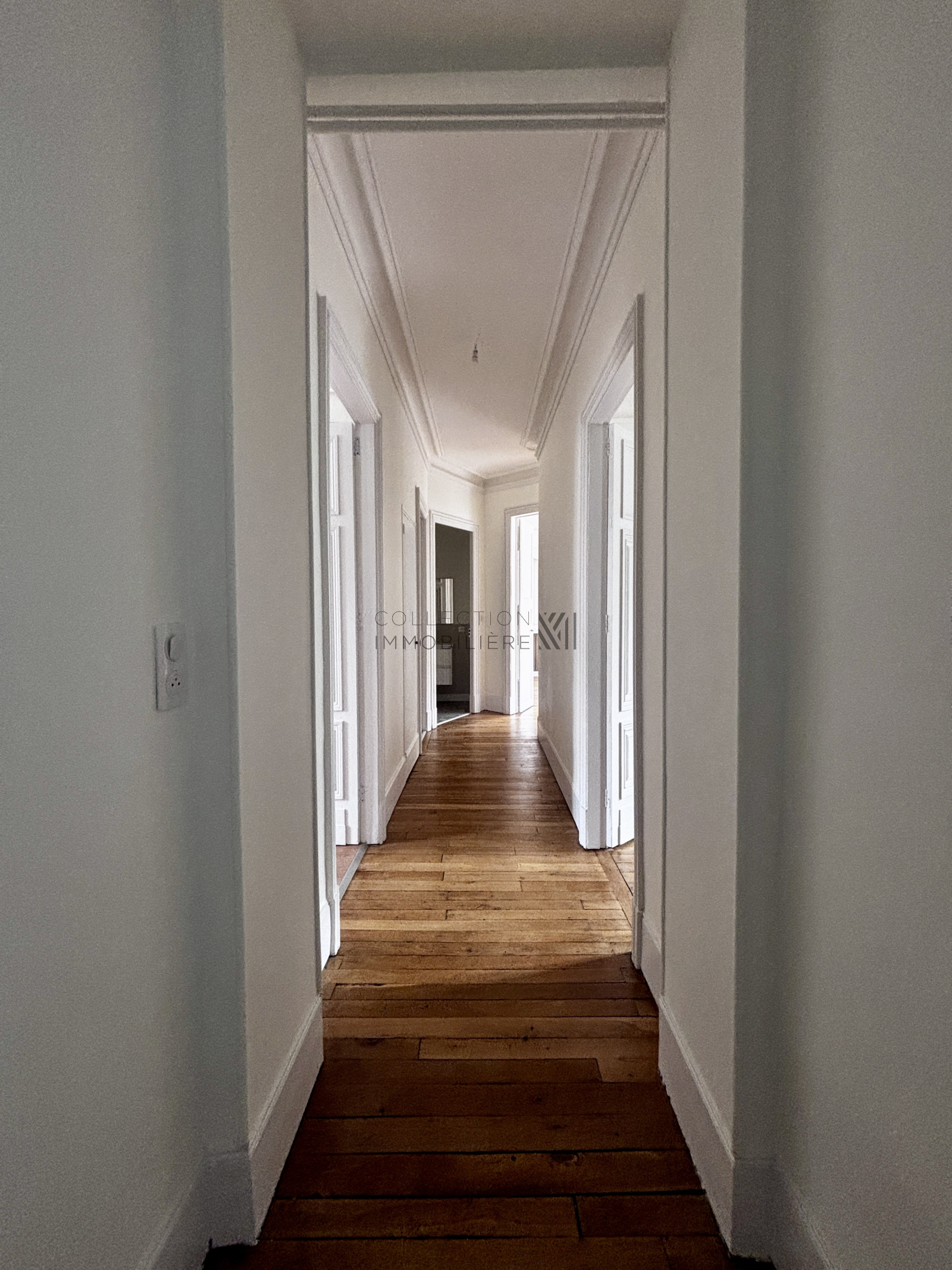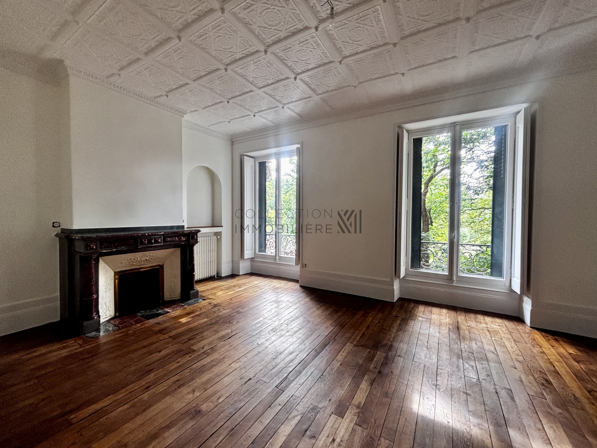 L’entrée s’ouvre sur un magnifique double séjour lumineux, doté d’un parquet d’origine, de plafonds ornés de moulures et de cheminées en marbre, créant une atmosphère chaleureuse et raffinée.