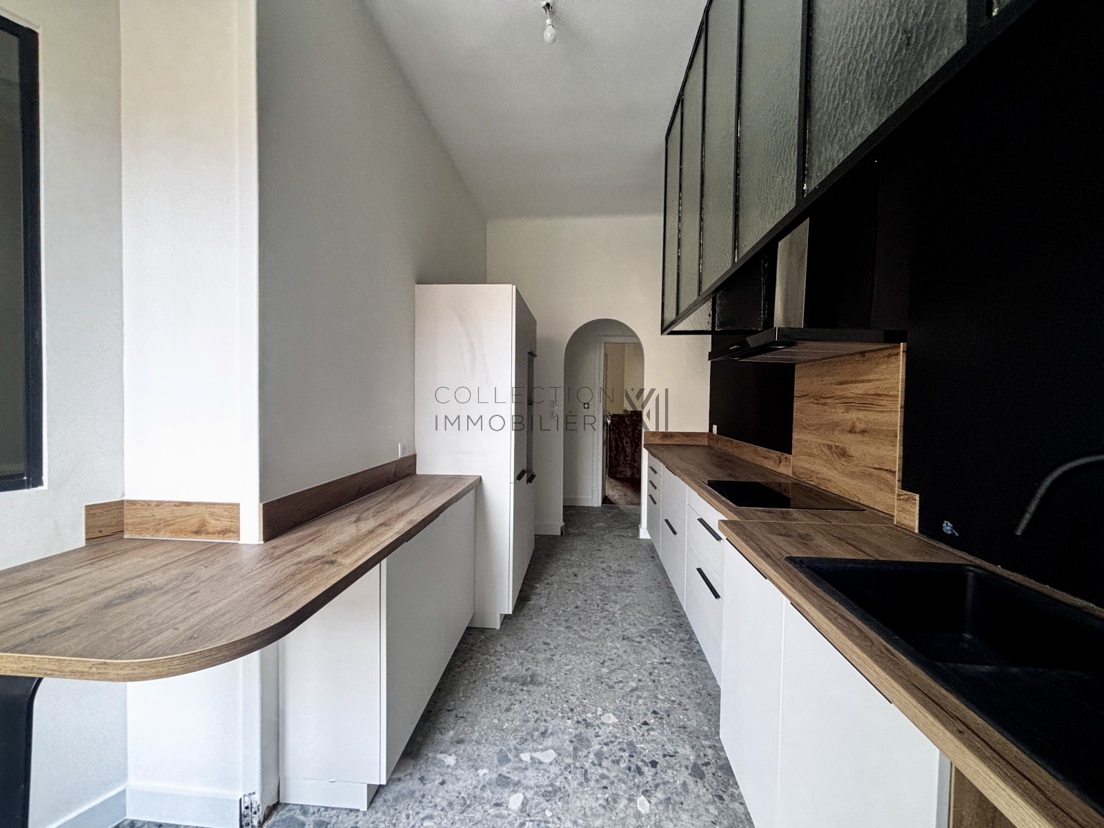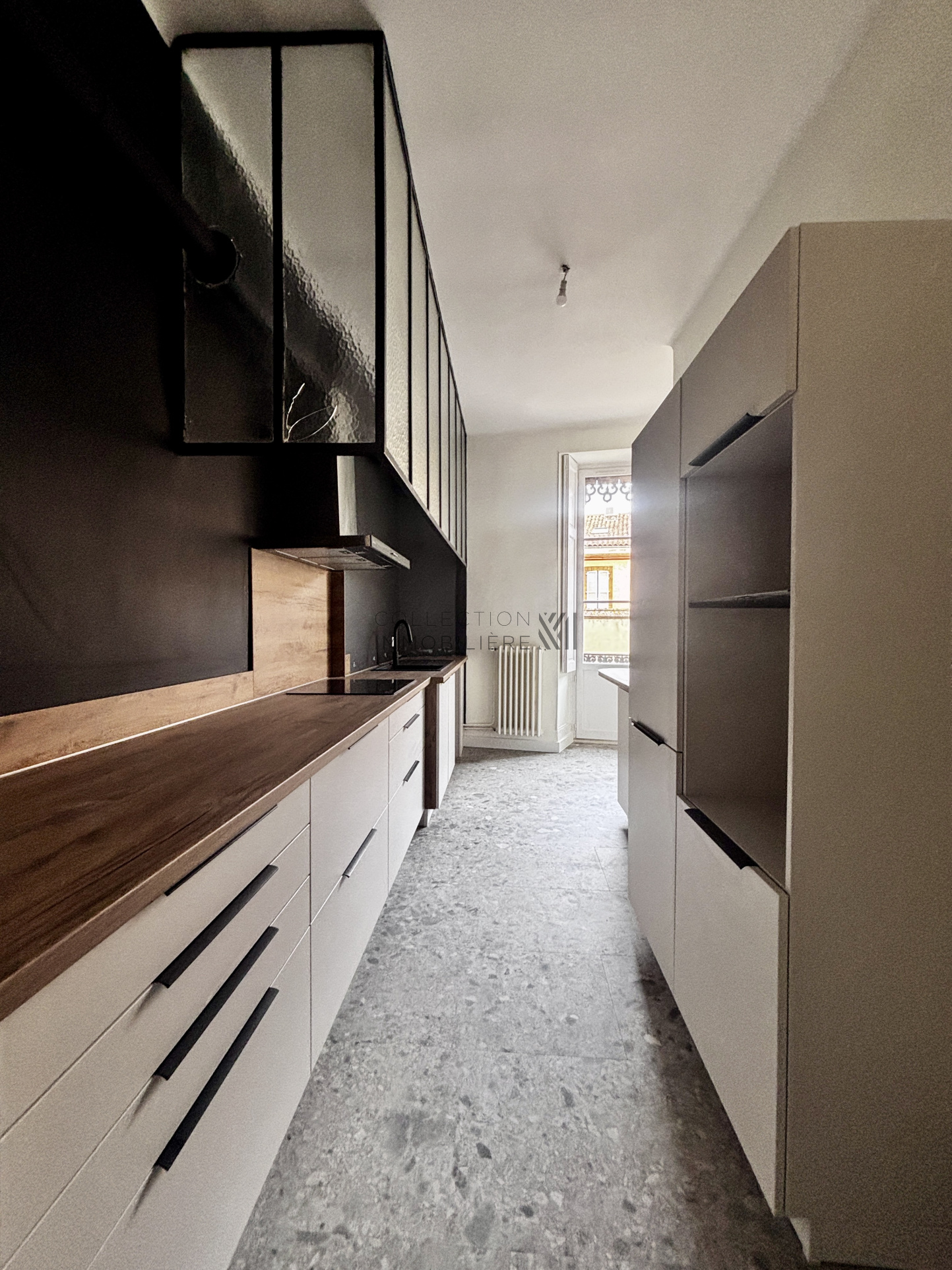 La cuisine moderne, entièrement neuve, aménagée et équipée, s’accompagne d’une buanderie discrète avec offrant de nombreux rangements.
